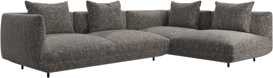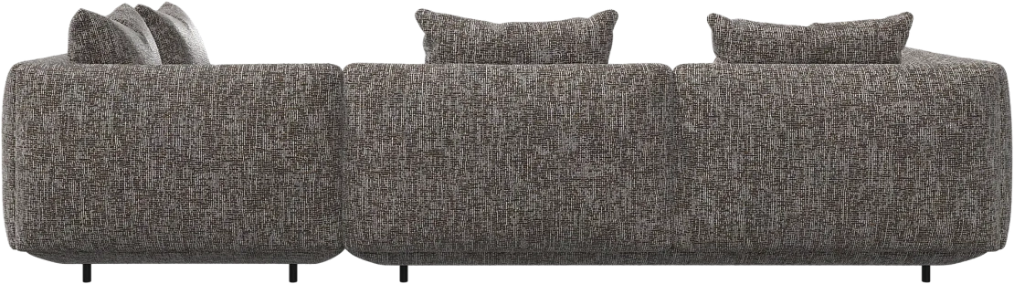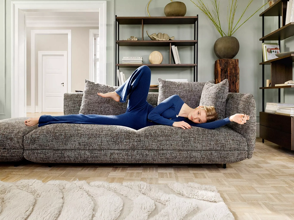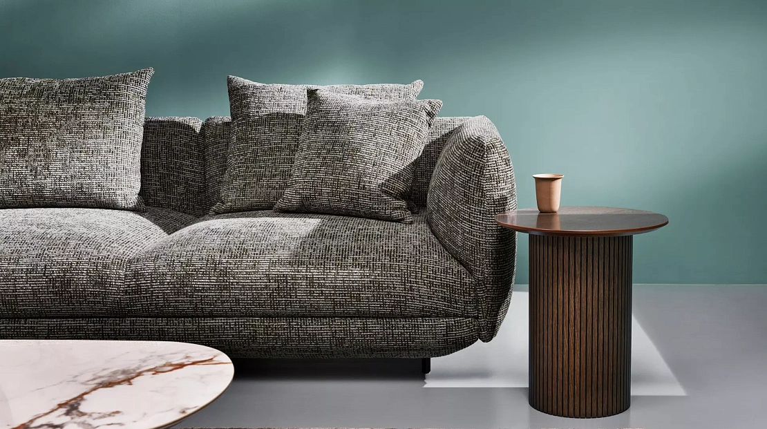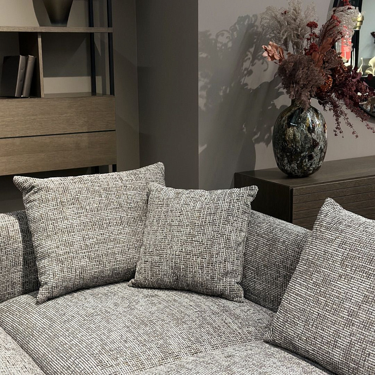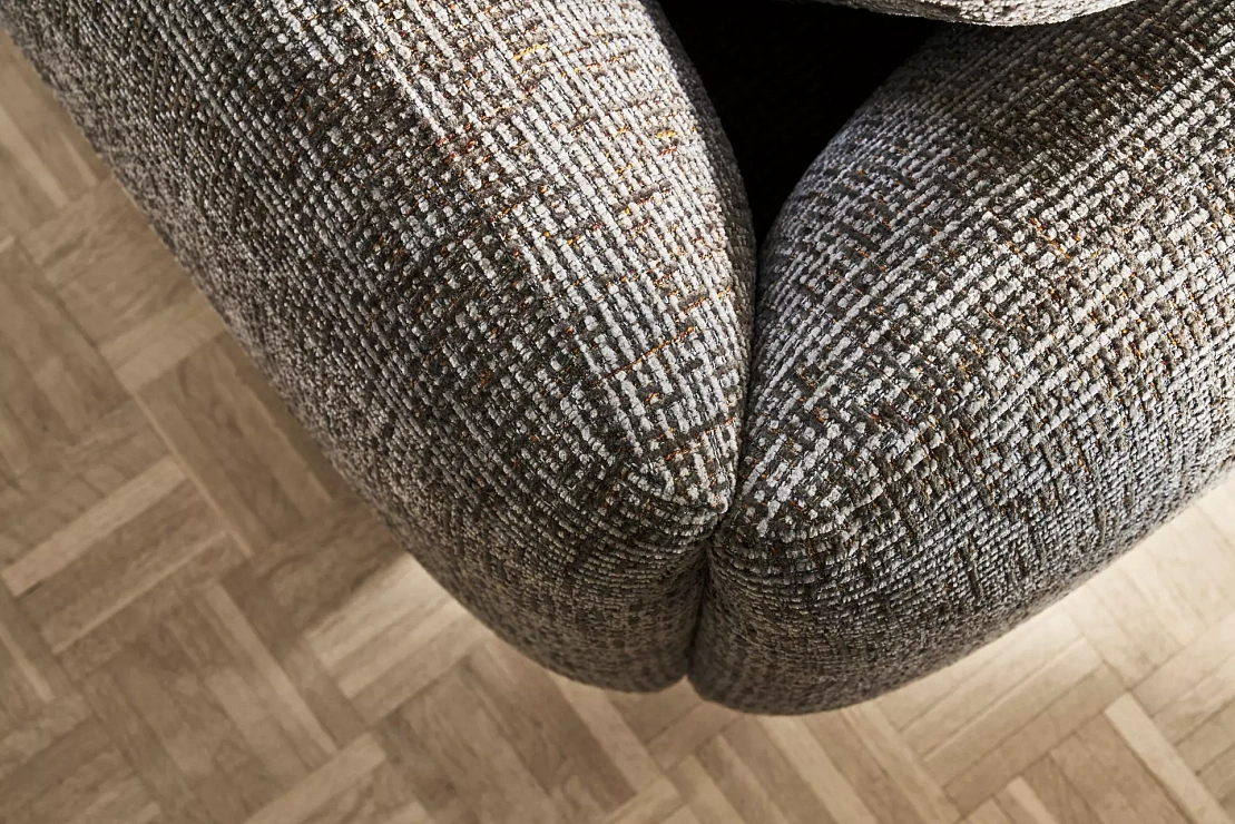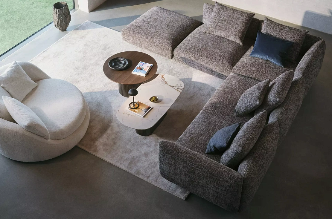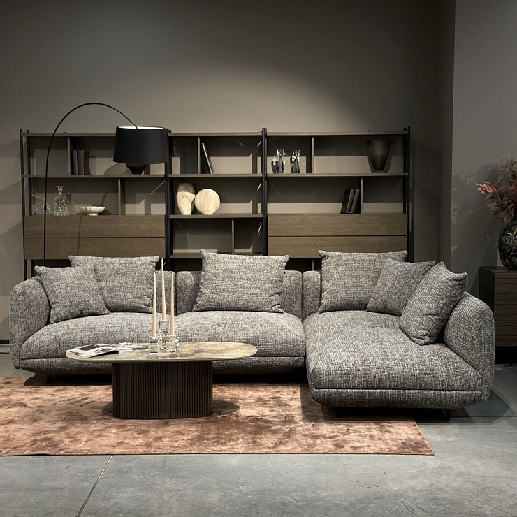 Диван Salamanca отличается щедрыми пропорциями и мягкими изгибами. Их подчеркивают тонкие, едва заметные трубчатые ножки черного цвета, создавая низкий 'парящий' силуэт.