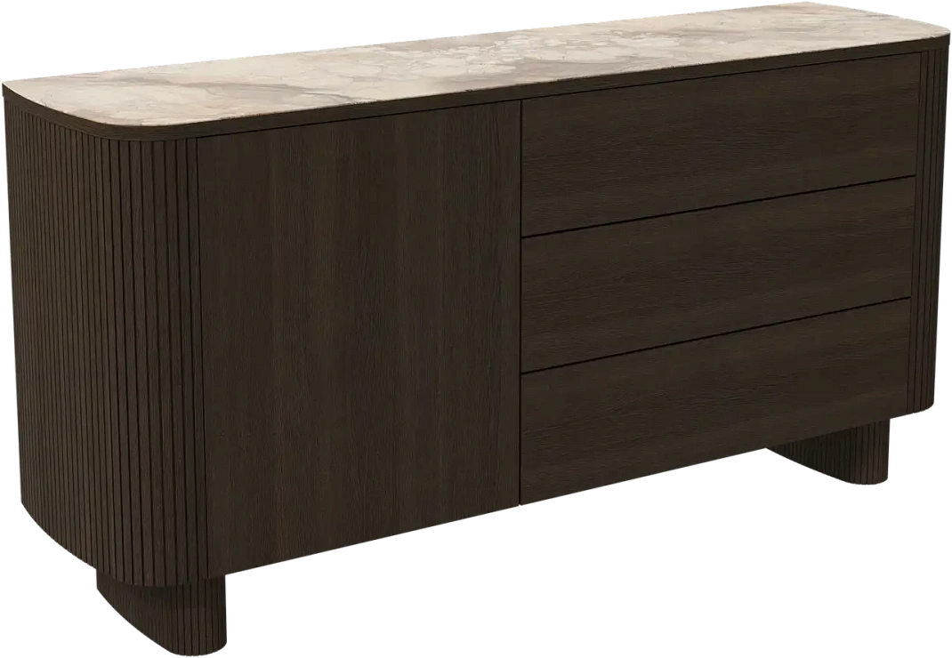 Буфет Santiago представлен в трех разных вариантах: с дополнительными выдвижными ящиками, с откидным фасадом с деревянной полкой, а также с барной секцией с зеркальной задней панелью и встроенной подстветкой, которая включается при открывании.