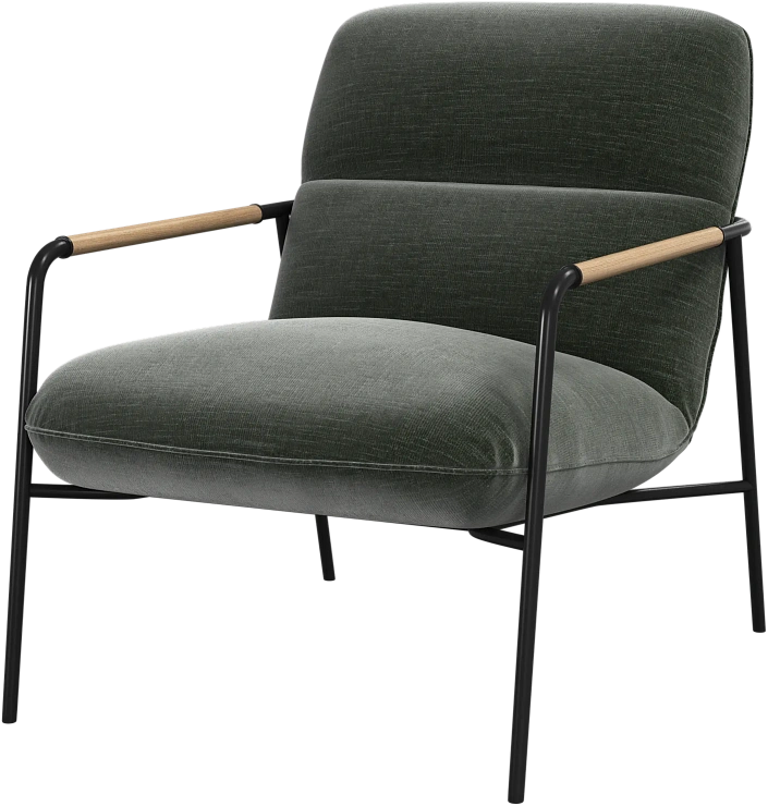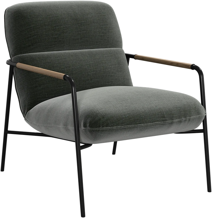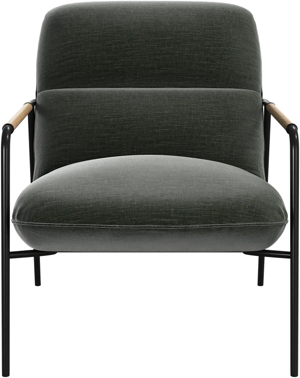 Матовая чёрная рама и дубовые подлокотники подчёркивают лаконичный дизайн и добавляют ему тёплый, натуральный акцент.
