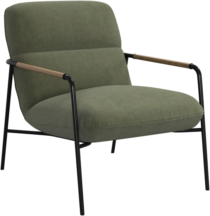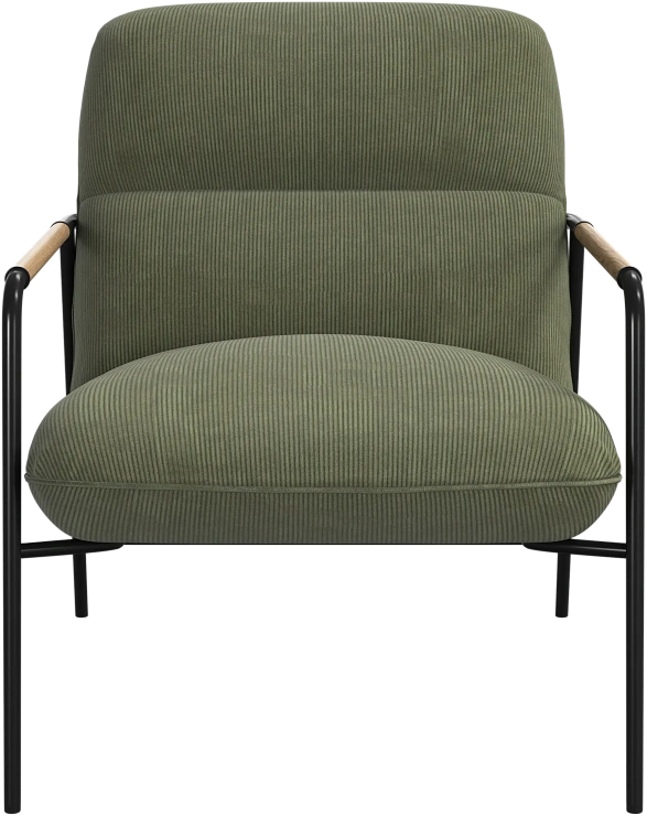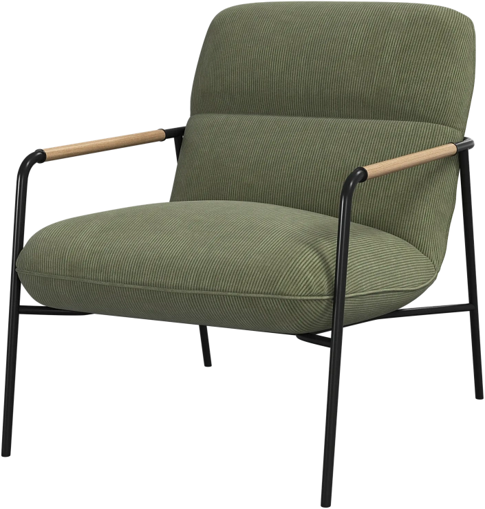 Матовая чёрная рама и дубовые подлокотники подчёркивают лаконичный дизайн и добавляют ему тёплый, натуральный акцент.